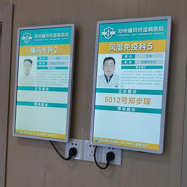 显示终端支持一级分诊(候诊区综合屏)、二级分诊(诊室门楣屏);一级分诊屏与二级分诊屏共有功能:1、显示医院logo、医院名称、日期时间、诊区名称或科室名称;2、显示公告